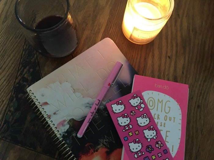 Every Sunday, I have a little ritual that goes something like this: I gather my notebooks, pens, a nice glass of wine, and a candle. Oh – and stickers! I’m all about stickers, peeps. I sit down and plot out my week on my planner – and then I decorate it. Why decorate? It’s because I like to have something fun to look at every day. Here’s my set up: